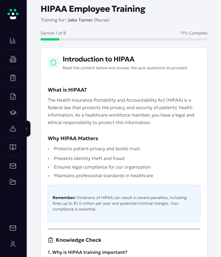 HIPAA compliance isn't just about policies—it's about people. HIPAA Hub provides comprehensive training modules and certification tracking to ensure every team member understands their role in protecting patient privacy.